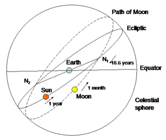 Как видно для наблюдателя на Земле, на мнимой небесной сфере Луна пересекает эклиптику два раза в месяц в позициях, называемых узлами. Полнолуние может прийтись на такую позицию, на узел, тогда можно наблюдать лунное затмение. (Примечание: масштаб не соблюдён.)
