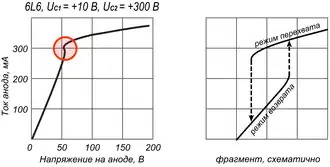 На инструментально снятых ВАХ в зоне перехода нередко изображается «гистерезисная» S-образная петля, соответствующая скачкообразному увеличению тока анода при малом приращении анодного напряжения. При уменьшении анодного напряжения скачок тока происходит при несколько меньших значениях тока и напряжения. Причина этого явления в том, что в зоне перехода при одном и том же значении анодного напряжения возможны два различных распределения пространственного заряда. Резкие, практически мгновенные перераспределения пространственного заряда и порождают скачки тока[23]. Усилительные каскады проектируют так, чтобы лампа всегда работала в режиме перехвата, поэтому на практике гистерезис в зоне перехода не имеет значения.