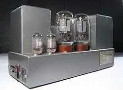 Лучевые тетроды, как и пентоды, могут использоваться в триодном включении — для этого достаточно замкнуть экранирующую сетку на анод. Именно триодный режим использовался в классическом усилителе Вильямсона; такой усилитель на паре лучевых тетродов KT66 в классе AB1 выдавал в нагрузку 15 Вт выходной мощности[37]. В практике современных однотактных УМЗЧ такой подход применяется редко — в этих усилителях доминируют триоды прямого накала[38], реже встречаются УМЗЧ на «стабилизаторных» триодах косвенного накала (12AS7, 6C33C, 6C19П).