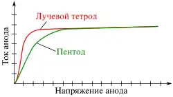 Так как лучевые тетроды имеют меньшее напряжение насыщения чем пентоды (см. рисунок), это повышает амплитуду изменения анодного напряжения и мощность в нагрузке при прочих равных условиях[36].