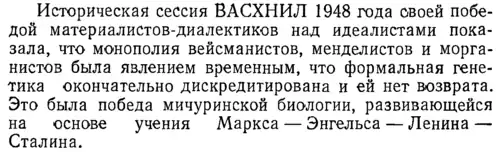 «Учение диалектического материализма о взаимозависимости и взаимообусловленности, о непрерывном движении и изменении в природе, где всегда что-то возникает и развивается, что-то отживает и разрушается, вооружило идейно Мичурина и Лысенко и дало им возможность выйти победителями из борьбы с метафизиками и идеалистами, с последователями Вейсмана, Менделя и Моргана».