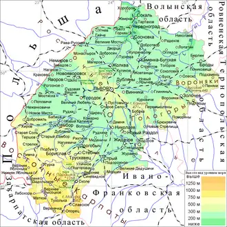 Львовская область расположена главным образом в пределах Волынской (Сокальское пасмо; 200—276 м) и Подольской (300—400 м) возвышенностей (Волыно-Подольская возвышенность), отдельные части которых называются: Малое Полесье (Верхнебужско-Стырьская равнина; 284 м), Расточье (высота 414 м), Ополье; Гологоры (Камула, 472 м; высшая точка возвышенности) и Вороняки (436 м) (Гологоро-Кременецкий кряж). Южнее тянется полоса предгорий Карпат, для рельефа которых характерно чередование террасовых равнин [Верхнеднестровской (Надсянской, Сяно-Днестровской водораздельной и Приднестровской равнин), Стрыйской и других] с увалистыми и плоскими водоразделами (высота 300—400 м).