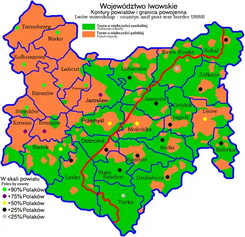 В соответствии с решениями Тегеранской конференции, в октябре 1944 года к Польше перешли следующие районы Львовской области: