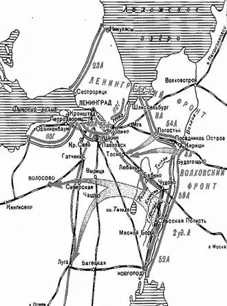 - 54-й армии, входившей в состав Ленинградского фронта и располагавшейся к северо-востоку от реки Волхов, ставилась задача взаимодействия с 4-й армией;