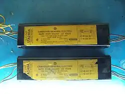 - Электронный пускорегулирующий аппарат, работающий на повышенной частоте, более компактный[33], не создаёт шума при работе, однако более дорог и может быть повреждён как из-за проблем в питающей сети (импульсные перенапряжения, повышенное напряжение), так и при неисправности ламп. Электронные пускорегулирующие аппараты в зависимости от сложности и качества исполнения схемы могут иметь различный коэффициент мощности, уровень пульсаций света и режим запуска ламп — качественные электронные пускорегулирующие аппараты позволяют добиться большего срока службы, более высокой светоотдачи по сравнению с традиционными электромагнитными, и почти полного отсутствия пульсаций[33]. Электронный балласт может создавать дополнительные помехи в питающей сети.