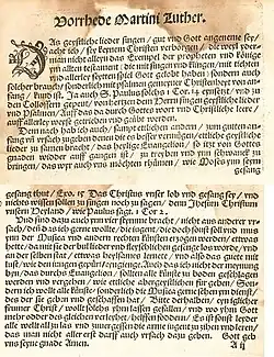Вопрос о том, насколько велик персональный вклад Лютера в музыку Протестантской церкви, на протяжении веков неоднократно пересматривался и остался дискуссионным. Некоторые церковные песни, написанные Лютером при активном участии Иоганна Вальтера, вошли в первый сборник четырёхголосных хоральных обработок «Книжечка духовных песнопений» (Виттенберг, 1524)[* 5]. В предисловии к нему (см. приведённое факсимиле)[* 6] Лютер писал: