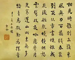 Общаясь с Кан Ювэем — выдающимся каллиграфом, Лян Цичао усердно занимался каллиграфическим искусством и коллекционировал эстампажи с каменных стел, запечатлевших образцовые почерки. Собственная манера письма Лян Цичао формировалась именно на основе немногих известных образцов эпохи Хань. Его почерку свойственны прямота и острые линии по углам иероглифов. Чэнь Юнчжэн характеризовал манеру Лян Цичао как «школярски изысканную»[9].