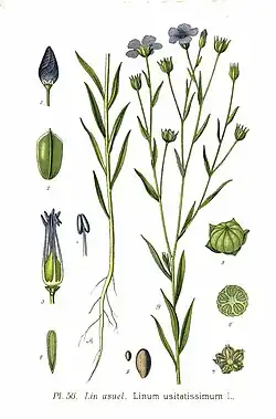 К роду Лён относятся больше ста видов, из которых самый важный — Лён обыкновенный, или прядильный (Linum usitatissimum L.) — однолетняя голая или почти голая (без волосков) трава; стебель высотой от 30 до 60 см, а в тёплых странах, например в Индии, ещё выше; ветвится только в верхней части, в соцветии; листья очерёдные, узколанцетные; цветки собраны вверху в виде ложного зонтика; чашелистики заострённые, мелкореснитчатые; лепестки голубые с сероватым отливом, иногда белые, широколопатчатые, пыльники голубые, плодник (льняная головка в просторечии) почти шаровидный, семена глянцевитые[2].