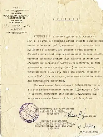 Согласно другим документам РЦХИДНИ, решение о сохранении тела Ленина было принято вскоре после его смерти[39]. После долгих споров идею сохранять тело Ленина максимально возможное время признали необходимой для пролетариата[40][29]. Академик Сергей Дебов писал: «Было бы безответственным называть какой-то определённый срок. Мы приложим все старания и умение, чтобы такое время было как можно более продолжительным, исчислялось столетиями[41]».