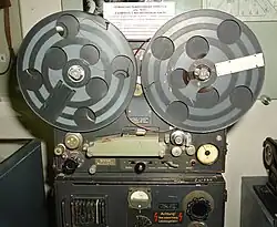- Многие модели первых магнитофонов разрабатывались для записи синхронной фонограммы в процессе кинопроизводства, и рассчитывались на перфорированную магнитную ленту сплошного полива, совпадающую по размерам с 35-мм и 16-мм киноплёнкой[6]. Поэтому в ЛПМ магнитофонов, как и в ЛПМ аппаратов оптической звукозаписи применялись зубчатые барабаны, и использовались скорости 18 и 46,5 см/сек, стандартные для таких же форматов киноплёнки. Это упрощало синхронизацию изображения со звуком при монтаже и последующем переводе магнитных фонограмм в оптическую.