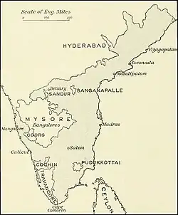 Мадрасское президентство аннексировало королевство Майсур в 1831 году по обвинению в плохом управлении[3] и вернуло его Чамарадже Водеяру (1881—1894), внуку и наследнику свергнутого Муммади Кришнараджи Водеяра (1799—1868) в 1881 году. Тханджавур был аннексирован в 1855 году после смерти Шиваджи II (1832—1855), который не оставил наследника мужского пола.