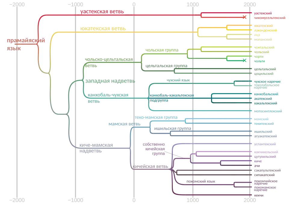 - восточночольская подгруппа: иероглифический майя †, чольти † (классический язык майя †), чорти