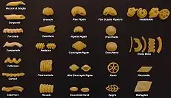 Макаро́нные изде́лия (иногда называют итальянским словом паста) — изделия различной формы из высушенного теста, замешанного из пшеничной муки и воды[3]. Как правило изготавливаются промышленным способом. В домашних условиях изготавливают лапшу, формально не относящуюся к макаронным изделиям, так как она обычно не подвергается сушке и употребляется сразу же после приготовления, в отличие от длительно хранящихся макаронных изделий (до двух лет[4]).