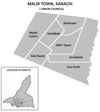 Техсил граничит с аэропортом Джинна и военным городком на севере и западе, с Шах-Файсалом и ручьём Тадо-Налло на юге, с Гадапом на востоке вдоль реки Малир. Состоит из 7 союзных советов.
