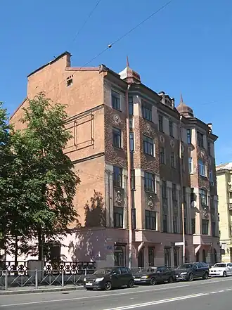 | № 32 | Дом Товарищества по устройству жилищ Петровского Коммерческого училища («Дом Товарищества на паях для устройства жилищ, учрежденного Обществом для пособия бывшим воспитанникам Императорского Санкт‑Петербургского Коммерческого Училища и их семействам»). Одно из первых в России зданий жилищных кооперативов. Включен в список объектов культурного наследия. Построен в 1907—1908 годах в стиле модерн с обильным лепным декором лицевого фасада; на уровне третьего этажа — крупное барельефное изображение богини Ники с лавровыми венками в руках и расправленными крыльями, под оконными проемами пятого этажа — лепной фриз с маскаронами в виде сов. В доме сохранились интерьеры парадных лестниц. В доме жили архитекторы Александр Владовский и Николай Макаров, а также гидротехник Борис Веденеев[2]. | А. И. Владовский | 1907—1908 | ![]() |