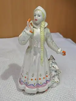 В более распространённом варианте Снегурочка предстаёт в образе, сформировавшемся в СССР после появления новогодних ёлок в 1930-х годах. У неё длинная коса, правая рука приподнята. На лице Снегурочки улыбка, она словно к чему-то прислушивается. Росписи статуэток варьировались в зависимости от времени и художника. Как правило, полихромная роспись дополнялась золотом. Эти статуэтки Дулёвский фарфоровый завод продолжает изготавливать и в 2020-х годах, однако современная роспись выполняется более простым способом с использованием люстра[1].