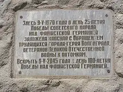 На Мамаевом кургане в день 25-летия Победы заложена капсула с обращением участников войны к потомкам, которая должна быть вскрыта 9 мая 2045 года на 100-летие Победы[11].