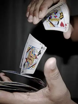 Манипуляции с игральными картами построены на использовании приёмов, позволяющих отвлечь внимание зрителей и практически не дающих возможности обнаружить обман ловкости рук. Эти процедуры требуют детальной проработки и значительной практики. Некоторые из них[6]:XXI: