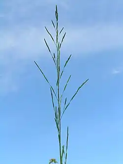 Колоски собраны в метёлки, на одной её веточке обычно по 3—4 узкоцилиндрических бледно-зелёных колоска 8—15 мм длиной. Веточки немного шероховатые, слабо отогнутые от оси метёлки. Колосковые чешуи яйцевидные, 1,5—3,5 мм длиной. Нижние цветковые чешуи с плёнчатым закруглённым концом, 3,5—5 мм длиной. Тычинки в числе трёх, с жёлтыми пыльниками 0,8—1,4 мм длиной.