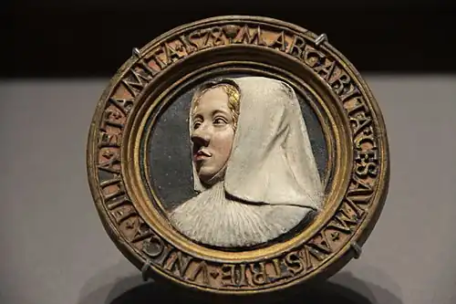 Этот медальон был выполнен ее придворным скульптором Конрадом Майтом и изображает Маргариту во вдовьем одеянии. Надпись относится к ее положению как дочери Максимилиана I и тетки императора Карла V. Оригиналом для глиняного медальона, несомненно, послужила деревянная несохранившаяся модель, с которой можно было снимать оттиски, чтобы распространять портрет регентши.