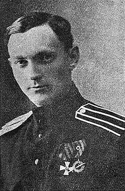 За то, что в бою, 28 мая 1916 года, при сел. Доброноуц, командуя полуротою второй роты 127-го пехотного Путивльского полка, во время атаки на сильно укрепленную высоту «458», первым ворвался в окопы противника, увлекая своим примером подчиненных и лично захватил траншейное орудие, причем были взяты пленные и трофеи[3].
