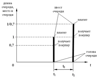Например, товар продаётся за 70 % от суммы издержек на его производство и прибыли организатора схемы (). После того, как все участники сдадут деньги, товар получат только 70 % от участников. Далее в конец очереди присоединяется новый участник, а участник, занимающий место, отстоящее от начала очереди на 70 % всей длины очереди, получает товар (см. рисунок). Аналогично обстоят дела в любой момент развития схемы. Присоединившийся в конец очереди и сам когда-нибудь получит товар, допустим, через период времени (на рисунке человек, стоящий на позиции , платит в момент времени и получает покупку в момент времени ). Этот период не превышает разумного предела, чтобы покупатель не беспокоился. Допустим, фиксированный. Тогда за время длина очереди должна вырасти в раз. Таким свойством обладает показательная функция . Таким образом, количество участников схемы должно расти экспоненциально.
