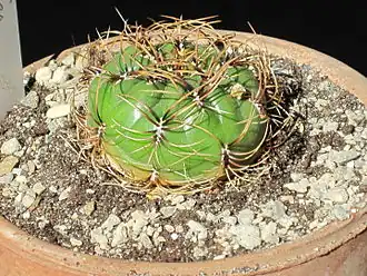 Кактус сплющенно-шаровидной формы, высотой 10 и диаметром до 12 см. Корень стержневой. Колючки закрученные, янтарного цвета. Цветки жёлтые или золотистые, длиной 5 см и 3—4 см диаметром; раскрыты круглые сутки. Цветёт весной и летом. Размножается семенами. В естественной среде обитания растёт медленно, но значительно быстрее в условиях неволи[4].