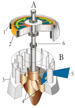 Энергетическая машина: гидравлическая турбина с электрическим генератором. A: генератор, В: турбина, 1 — статор, 2 — ротор, 3 — направляющий аппарат, 4 — лопасти турбины, 5 — поток воды, 6 — вал турбины и генератора.