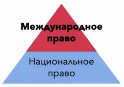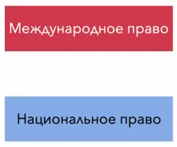 | Субъекты | участники международного общения, в первую очередь государства и международные организации; вступление в урегулированные международным правом отношения негосударственных агентов является скорее исключением, чем правилом. | физические и юридические лица — главные субъекты внутригосударственного права; иностранные правительства и уж тем более другие государства как публично-правовые образования национальным нормам не подчиняются. |