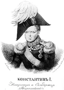 - ↑ Факт чеканки рубля после вступления на престол Николая I был засекречен, печатные напоминания о временном императорстве Константина были уничтожены. В экспозиции некоторых музеев сохранились редкие экземпляры литографированных портретов Константина Павловича с надписью: «Константин I, император и самодержец всероссийский»