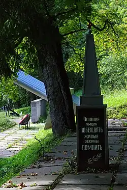 «АВРОРОВЦАМ. На рубеже от Вороньей горы до Киевского шоссе в сентябре 1941 года занимала позицию батарея из 9 орудий, снятых с крейсера „Аврора“, стойко защищая город Ленина от фашистских захватчиков».