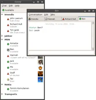 Почти для каждой из сетей есть свой мессенджер, разработанный той же командой разработчиков. Так, для пользования тремя последними из вышеуказанных сетей разработчиками предлагаются программы с одноимёнными названиями: ICQ, Windows Live Messenger, Yahoo! Messenger, а также Skype. Таким образом, если один из адресатов пользуется только сетью ICQ, а другой — только сетью MSN, то можно общаться с ними одновременно, установив на своем компьютере и ICQ, и MSN Messenger и зарегистрировавшись в обеих сетях (либо через соответствующие транспорты в XMPP).