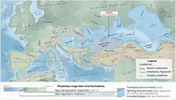 Палеогеографическая реконструкция флуктуаций Паратетиса в позднем миоцене. Во время фаз регрессии поверхность озера-моря резко ужималась. Оставшаяся вода распределялась между центральным солёным озером во впадине Чёрного моря (закрашена красным) и периферийными впадинами, которые периодически заполнялись водой и становились более пресными (светло-голубой)[20].