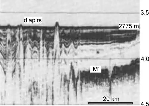 Сейсмческий профиль 1965 г. с диапирами, пробившими Reflector "M" и образовавшими поднятия на морском дне. Вертикальная шкала — полное время пробега (прямой и отражённой волны) в секундах (two-way travel time, twtt).