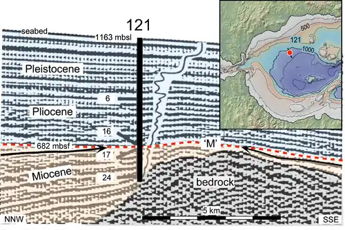 Сейсмический профиль в точке 121 (проект DSDP) в Альборанском море[43]. Красной пунктирной линией, подписанной Reflector M, показано несогласие, разрезающее до-мессинские миоценовые рефлекторы и накрытое ранне-плиоценовыми мергелями. График — скорость бурения, которая падает при достижении сильных отражателей. Числа — идентификаторы керна. Seabed — морское дно, mbsl — метров ниже уровня моря.