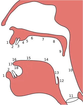 Места образования согласных (активные и пассивные): 1. Внешнелабиальные, 2. Внутрилабиальные, 3. Дентальные, 4. Альвеолярные, 5. Постальвеолярные, 6. Препалатальные, 7. Палатальные, 8. Велярные, 9. Увулярные, 10. Фарингальные, 11. Глоттальные, 12. Эпиглоттальные, 13. Радикальные, 14. Постдорсальные, 15. Предорсальные, 16. Ламинальные, 17. Апикальные, 18. Субапикальные