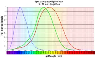 У высших приматов (узконосые и частично широконосые обезьяны), в том числе и у человека, имеется три типа колбочек; светочувствительные пигменты в этих колбочках способны преимущественно воспринимать свет в фиолетово-синей, зелёно-жёлтой и жёлто-красной частях спектра. Диапазоны чувствительности этих трёх типов колбочек частично перекрываются[5][6]. От колбочки в головной мозг поступает сигнал, кодирующий интегральное значение интенсивности светового излучения в соответствующей части спектра. Таким образом, человеческое цветовое зрение является трёхстимульным анализатором: характеристики цвета выражаются всего в трёх значениях. Если свет с разным спектральным составом производит на колбочки одинаковое интегральное действие, соответствующие цвета воспринимаются как одинаковые.