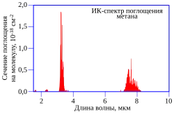 Является парниковым газом, более сильным в этом отношении, чем углекислый газ, из-за наличия глубоких колебательно-вращательных полос поглощения его молекул в инфракрасном спектре. Если степень воздействия углекислого газа на климат условно принять за единицу, то парниковая активность того же молярного объёма метана составит 21—25 единиц[37][38]. Однако время жизни метана в атмосфере невелико (от нескольких месяцев до нескольких лет), поскольку он окисляется кислородом до углекислого газа в тропосфере под действием грозовых разрядов и в стратосфере под действием УФ-С излучения Солнца.