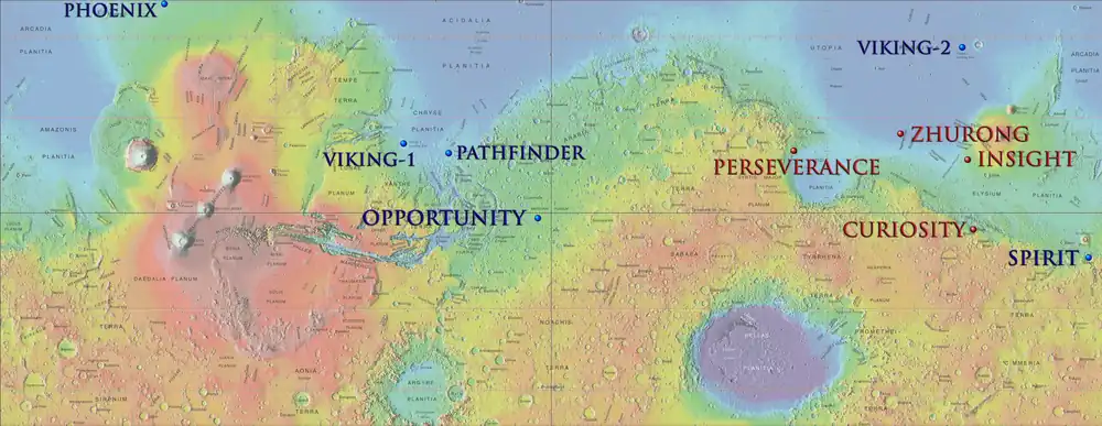 Экспедиции, работавшие (надписи синим цветом) и продолжающие работать (надписи красным цветом) на Марсе по состоянию на 2022 год