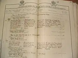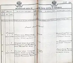 • «О родившихся». Помимо порядкового номера в первой части указывались дата рождения и крещения, пол новорождённого и данное ему имя. Место жительства, сословная принадлежность, если это крепостной, то владельческая принадлежность (например, какому помещику принадлежали), вероисповедание, национальность, имя, фамилия, отчество отца и матери (или указывалось на незаконность рождения). Записывались крёстные родители (восприемники), их местожительство, сословная и все остальные сведения. Указывалось, кто из священно- и церковнослужителей крестил ребёнка и где этот обряд происходил — в доме прихожанина или в церкви.
