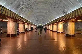 1. Сам по себе термин «станция глубокого заложения» означает, однако, не глубину станции как таковой, а, согласно строительным нормам и правилам (СНиПам), закрытый способ её строительства[10]: так, например, глубина станций «Охотный Ряд», «Библиотека имени Ленина» и «Кунцевская» Московского метрополитена, сооружённых закрытым и открытым способом, составляет 15, 12 и 37,6 м соответственно[11][12][13]; самой глубокой станцией в мире с 6 ноября 1960 года — открытия первой очереди Киевского метрополитена по 2022 год была станция «Арсенальная» — 105,5 м[14], после чего этот статус отошёл станции «Хунъянцунь» Чунцинского метрополитена — 116 м[15][16][17][18][19]. В отличие от самой глубокой в СНГ «Адмиралтейской»[20] (86 м[21]), глубина «Арсенальной» обусловлена не заложением станции, а возвышенностью местности[22]