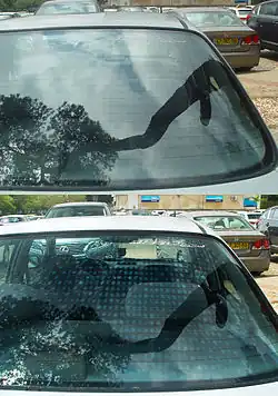 Заднее закалённое стекло автомобиля. Изменения напряжения в стекле чётко видны при фотографировании через поляризационный фильтр (нижний рисунок).