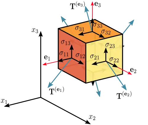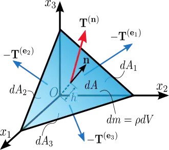 Однако Коши заметил, что вектор напряжения заданный на поверхности всегда будет линейной функцией вектора нормали к поверхности  — вектору единичной длины, перпендикулярному ей. То есть, где функция удовлетворяет соотношению