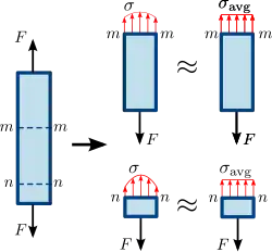Этот анализ предполагает, что напряжение равномерно распределено по всему поперечному сечению. На практике это предположение может оказаться неверным, в зависимости от того, как крепится стержень на концах и как он был изготовлен. В этом случае значение = F / A будет представлять только среднее напряжением, называемым инженерным напряжением или номинальным напряжением. Однако, если длина стержня L во много раз превышает его диаметр D, и он не имеет грубых дефектов или встроенных напряжений, то можно предположить, что напряжение равномерно распределено по любому поперечному сечению, расстояние до которого более чем в несколько D раз превышает расстояние от обоих концов. (Это наблюдение известно как принцип Сен-Венана).