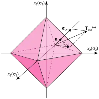 Рассматривая главные направления как оси координат, плоскость, вектор нормали которой составляет равные углы с каждой из главных осей (то есть, имеет направляющие косинусы, равные ) называется октаэдрической плоскостью. Всего имеется восемь октаэдрических плоскостей (рис. 6). Нормальные и сдвиговые компоненты тензора напряжений на этих плоскостях называются октаэдрическими нормальными напряжениями и октаэдрическими напряжениями сдвига , соответственно.