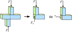 Как и в случае стержня с осевой нагрузкой, на практике напряжение сдвига не может быть равномерно распределённым по слою; поэтому, как и раньше, отношение F / A будет иметь смысл среднего («номинального», «инженерного») напряжения. Однако для практических целей этого среднего значения часто бывает достаточно:p.292. Напряжение сдвига наблюдается также, когда цилиндрический стержень, такой как вал, подвергается воздействию противоположных моментов на его концах. В этом случае напряжение сдвига в каждом поперечном сечении параллельно поперечному сечению, но ориентировано тангенциально относительно оси и увеличивается с увеличением расстояния от оси. Под действием изгибающих нагрузок в средней плоскости («стенке») двутавровых балок возникает значительное напряжение сдвига из-за того, что стенка ограничивает концевые пластины («полки»).