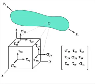 Количественно напряжение выражается вектором напряжения Коши Т, определяемым как сила F между соседними частями материала через воображаемую разделяющую поверхность S, делённую на площадь S при стремлении этой поверхности к нулю:p.41–50 В :p.41–50 жидкости сила перпендикулярна поверхности и представляет собой знакомое давление. В твёрдом теле или в потоке вязкой жидкости сила F может быть не перпендикулярна поверхности S; следовательно, напряжение на поверхности следует рассматривать как векторную величину, а не как скаляр. Более того, направление и величина обычно зависят от ориентации поверхности S. Таким образом, напряжённое состояние материала должно описываться тензором (второго ранга), называемым тензором напряжений (Коши); который является линейной функцией, связывающей вектор нормали n к поверхности S с напряжением T. По отношению к любой выбранной системе координат тензор напряжений Коши может быть представлен в виде симметричной матрицы вещественных чисел 3 × 3. Даже внутри однородного тела тензор напряжений может меняться в зависимости от координат и времени; следовательно, напряжение в материале, как правило, является изменяющимся во времени тензорным полем.