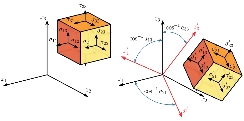 Можно показать, что тензор напряжений — это контравариантный тензор второго ранга. При переходе из xi системы координат в xi' систему координат, компоненты σij в исходной системе преобразуются в компоненты σij' в новой системе в соответствии с правилом преобразования тензора (рисунок 2.4):