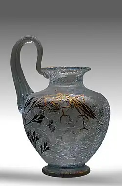 Стеклянная ваза с эффектом кракелюр. Трещины возникают в результате кратковременного, но интенсивного напряжения, возникающего при кратковременном погружении полурасплавленной детали в воду.