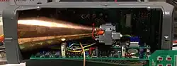 Современный радар для измерения скорости. На правом конце медной рупорной антенны находится диод Ганна (серая сборка), который генерирует микроволны